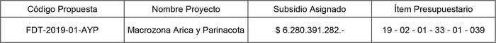 a) Lo solicitado por la interesada mediante Ingreso Subtel N° 85.487, de fecha 04.05.2020, complementado mediante Ingreso Subtel N° 92.570 de 11.05.2020, para el Proyecto Macrozona Arica y Parinacota, Código: FDT-2019-01-AYP, del Concurso Público "Fibra Óptica Nacional", Código: FDT-2019-01, cuya Propuesta consta de los Ingresos Subtel señalados en los literales k) y l) de los Vistos.