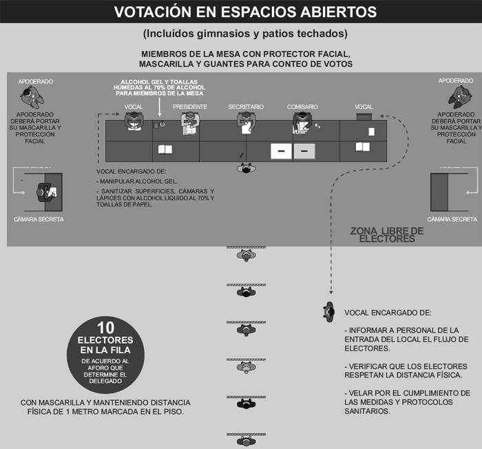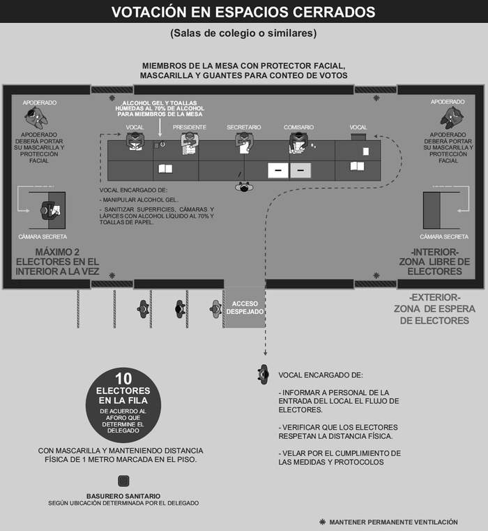 - Se recomienda que los locales de votación tengan habilitadas puertas de ingreso y salida distintas, para permitir el flujo unidireccional y evitar aglomeraciones.