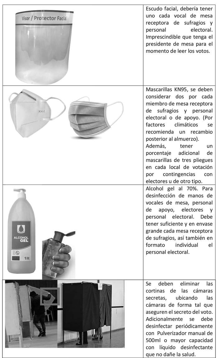 - El día de la constitución de mesas se dispondrá de kits sanitarios básicos para los vocales de mesas receptoras de sufragios y para personal con rol electoral (alcohol gel al 70% y mascarillas quirúrgicas desechables de tres pliegues).