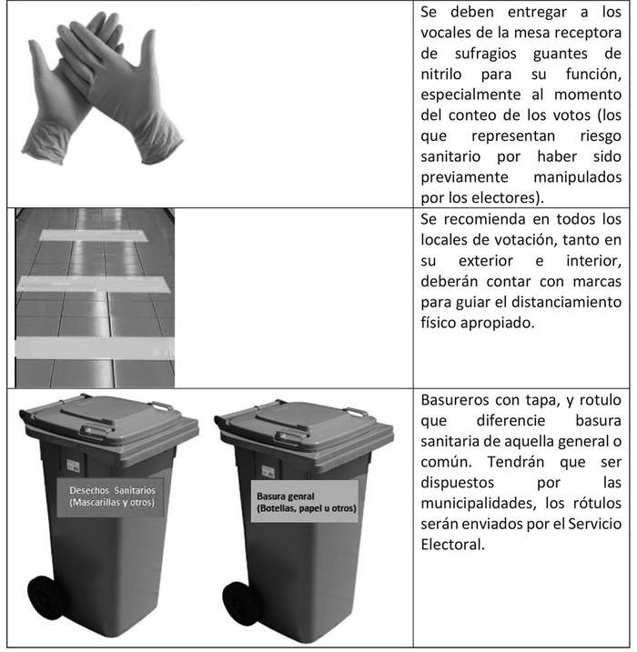 - Los locales de votación deberán ser sanitizados los días 23 y 24 de octubre en la madrugada. Para ello se solicitará la colaboración de las autoridades correspondientes, y de los propietarios y administradores de los recintos. Además, se solicita a los municipios realizar, durante la jornada del 25 de octubre, retiro periódico de basura y limpieza de locales.