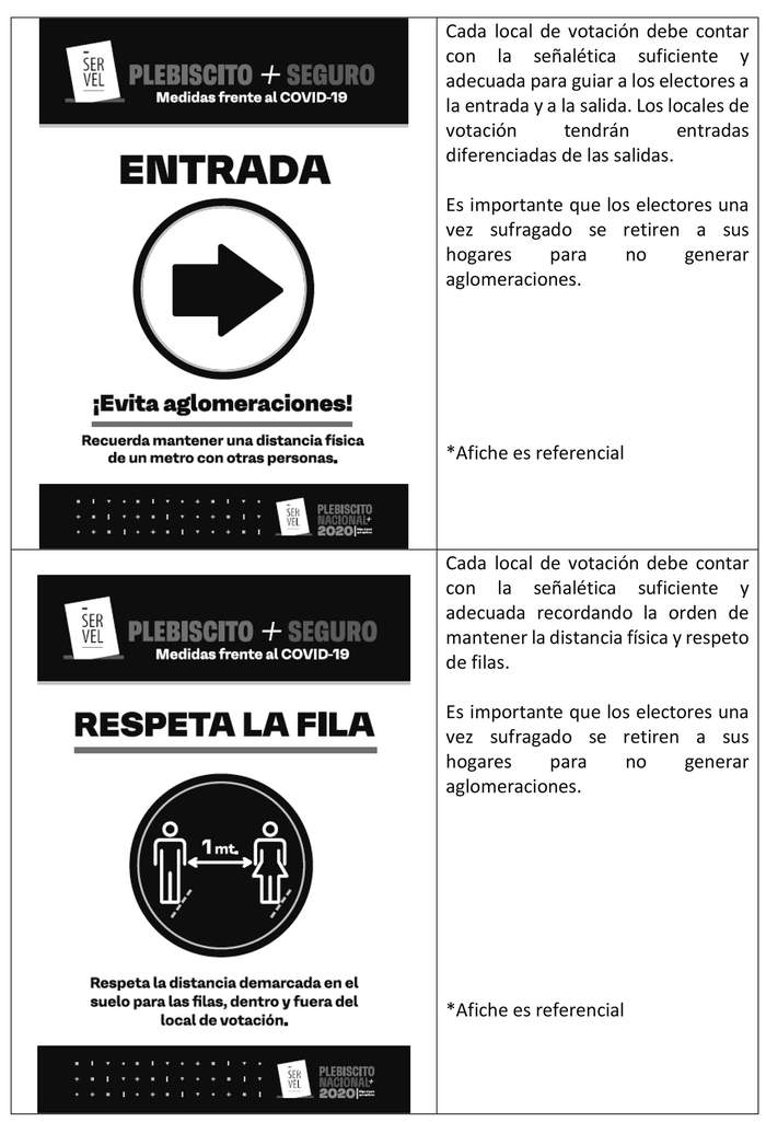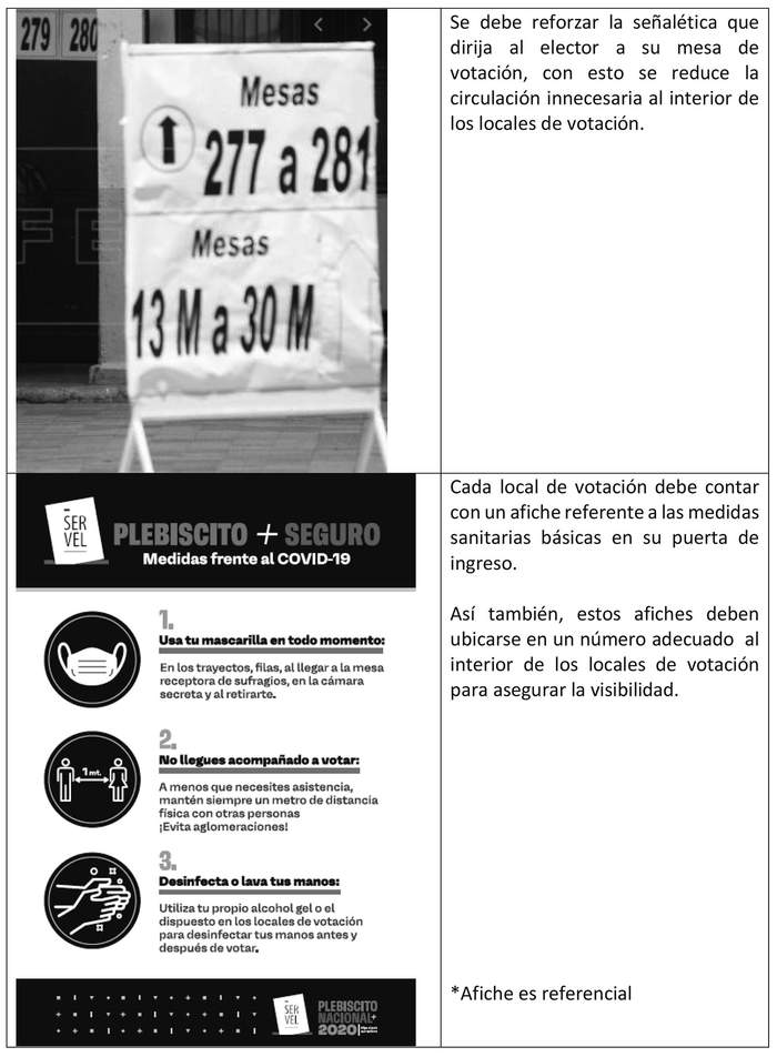 - Tanto en el exterior como en el interior de los locales de votación, se deben colocar afiches que orienten al elector sobre medidas sanitarias, entradas y salidas.