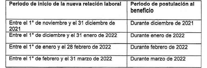 El trabajador beneficiario sólo podrá postular a esta bonificación durante el periodo de postulación al beneficio que corresponda con el inicio de la nueva relación laboral (en adelante, "Ventanas de Postulación").