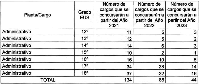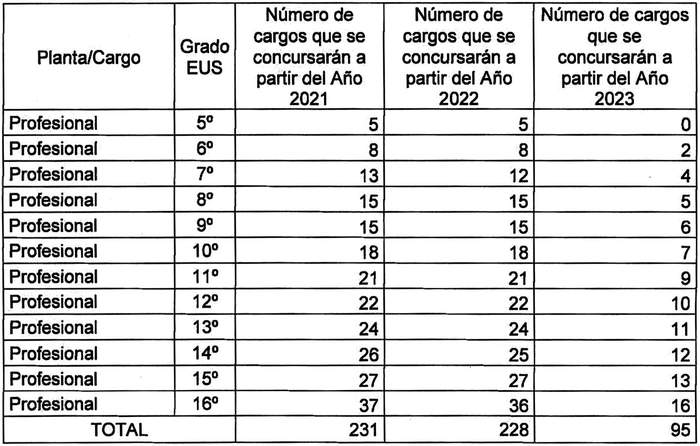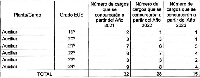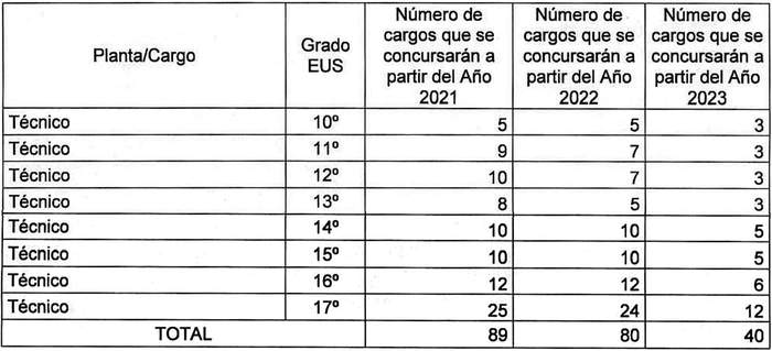 Artículo tercero. Una vez practicado el mecanismo señalado en el artículo anterior, los cargos señalados a continuación contemplados en la planta de profesionales, técnicos, administrativos y auxiliares fijada en el artículo 1º del presente decreto con fuerza de ley, serán provistos mediante el proceso establecido en la letra b) del artículo quinto transitorio de la ley Nº 21.209, los cuales podrán comenzar a proveerse de acuerdo a la siguiente gradualidad: