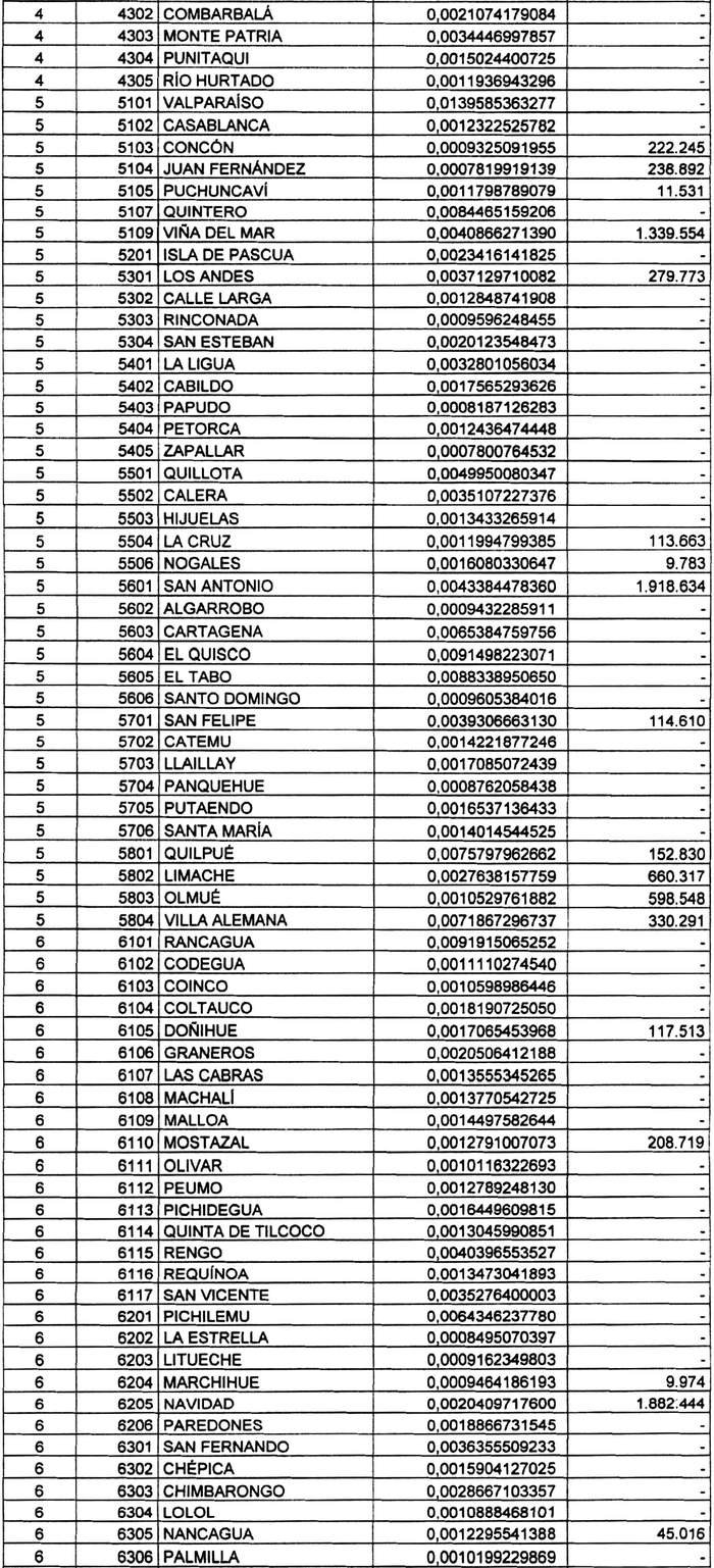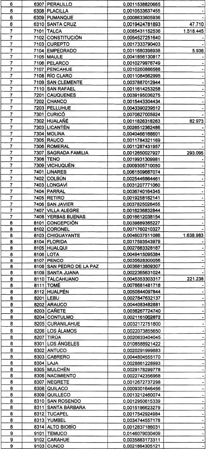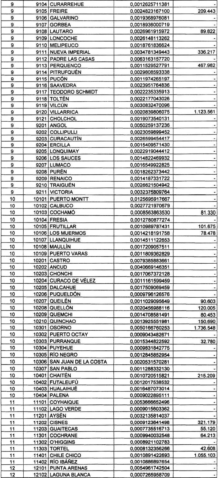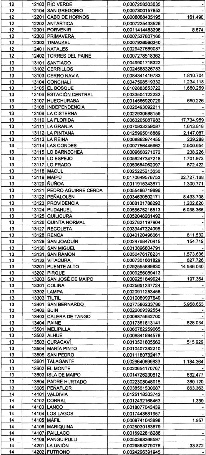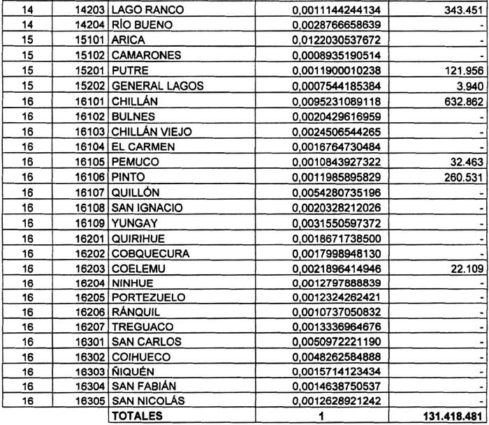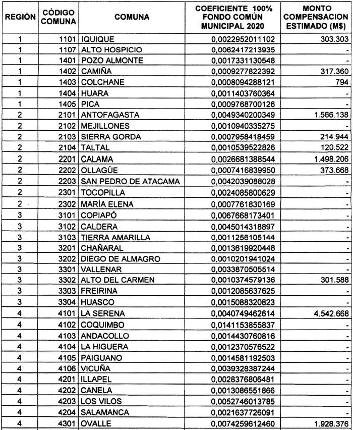Artículo 4°.- Fíjense para las comunas del país, durante el período que corresponde entre el 1° de enero y el 31 de diciembre del año 2020, los coeficientes de distribución del Fondo Común Municipal que se indican, y el monto total de M$ 131.418.481.- (ciento treinta y un mil cuatrocientos dieciocho millones cuatrocientos ochenta y un mil pesos) a percibir por las comunas que se indican por aplicación del mecanismo de estabilización: