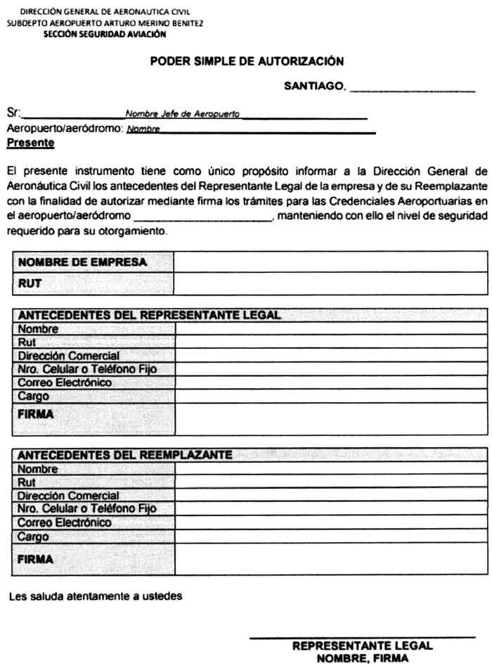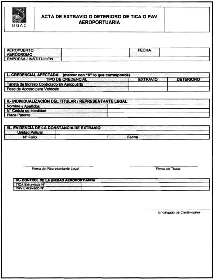 CAPÍTULO 4 REQUISITOS PARA EL OTORGAMIENTO Y REGULACIÓN DEL USO DE CREDENCIALES 4.1 Tarjeta de Ingreso Controlado de Aeródromos (TICA) 4.1.1 La TICA es un documento oficial que autoriza el ingreso de una persona a la parte aeronáutica y/o zonas de seguridad restringida de un determinado aeródromo. 4.1.2 Los datos o elementos oficiales que contendrá la TICA serán: a) Una fotografía del titular. b) Nombre del Titular. c) Número de la Cédula Nacional de Identidad. d) Fecha de vigencia de la TICA. e) Aeródromo y Zona de seguridad restringida para la cual es otorgada. f) Entidad a la que pertenece el titular. g) Número de la TICA. h) Una característica de seguridad para los componentes de seguridad privada que indique la función a ejecutar. 4.1.3 Se podrá otorgar TICA a: a) Funcionarios de la DGAC que cumplan funciones administrativas, operativas y que sean de la dotación permanente del aeródromo, y aquellos funcionarios DGAC que por razones de servicio requieran ingresar a la parte aeronáutica y/o Zona de Seguridad Restringida. b) Empleados de las concesionarias del aeródromo que se encuentren acreditadas ante la DGAC y/o del explotador del terminal de pasajeros, incluyendo las que brinden servicios a terceros cuya solicitud esté debidamente fundada. c) Empleados de las agencias de carga que se encuentren acreditadas por la Autoridad Aeronáutica. d) Empleados de las empresas externas prestadoras de servicios de la DGAC, como al explotador comercial del terminal pasajeros, que se encuentren debidamente acreditadas. e) Personal que desarrolla labores de Seguridad Privada y de Transporte de Valores que se encuentren acreditadas por la Autoridad Aeronáutica. f) Personal de los servicios públicos que desarrollen funciones permanentes en el aeródromo. g) Personal de las Embajadas y/o de Organismos Internacionales que se encuentren acreditadas ante el Ministerio de Relaciones Exteriores y otros Estados en coordinación con la DGAC; h) Clubes aéreos. i) Hangares particulares o corporativos. j) Empresas de aviación general. k) Personal de entidades autorizadas por el Servicio Nacional de Aduanas indicadas en el párrafo 3.1.1 letra l) que realicen funciones para la tramitación y recepción en la zona primaria de jurisdicción de Aduana y aquellos que necesiten realizar aforo físico o reconocimiento de mercaderías, en coordinación con el Servicio Nacional de Aduanas. 1) Empresas prestadoras de servicios tercerizados (son aquellas que son contratados por las subconcesiones y no tienen relaciones contractuales con el explotador de terminal o con la DGAC). 4.2 Tipos de TICA: a) Definitiva, b) Provisoria, c) Transitoria. 4.3 De la tramitación de TICA 4.3.1 Las entidades indicadas en el párrafo 3.1.1 tramitarán sus solicitudes de credenciales aeroportuarias a través de los sistemas informáticos habilitados por la DGAC, el cual contará con manuales y guías de uso del sistema, estableciendo las responsabilidades para cada participante en el proceso. 4.3.2 El solicitante de una credencial deberá completar de manera fidedigna la totalidad de los datos requeridos en el formulario o en los sistemas informáticos habilitados por la DGAC y tomar conocimiento bajo firma o aceptación de su responsabilidad. El representante legal o representante de la empresa deberá asegurar que el titular de una TICA cumpla con sus obligaciones y responsabilidades. 4.3.3 Cuando la solicitud de credenciales se realice a través del explotador de terminal de pasajeros, el proceso de tramitación, las responsabilidades y el control de los subconcesionarios debe estar definido en su programa de seguridad. 4.3.4 En aquellos casos en que una solicitud en línea se ha mantenido sin actividad en cualquiera de sus etapas por más de treinta (30) días, se entenderá como un proceso cerrado, debiendo realizar el solicitante una nueva solicitud. 4.3.5 En los aeródromos que no cuentan con un sistema informático habilitado, la solicitud deberá ser presentada, mediante formulario indicado en el anexo A, de manera presencial a través del explotador del terminal de pasajeros, del Jefe del Aeródromo, o del Director de Aeródromos y Servicios Aeronáuticos, según sea el caso. El formulario antes señalado se encontrará disponible en el sitio web institucional. 4.3.6 El representante legal de una empresa deberá informar al jefe de aeródromo, mediante formulario del anexo B al responsable de la empresa autorizada a tramitar credenciales ante la DGAC. 4.3.7 Tramitación de la solicitud de TICA definitiva. Una solicitud de TICA definitiva deberá ser acompañada de los documentos que se indican: a) Formulario de solicitud de TICA firmado por el titular y el representante de la empresa. En el caso del sistema en línea el formulario deberá ser completado de acuerdo a lo que indica el sistema para ello. b) Certificado de antecedentes para fines especiales, con una vigencia no superior a 60 días. En formato digital cuando se tramita por sistema en línea. c) Fotocopia del contrato de trabajo y/o anexo del mismo, según corresponda. En formato digital cuando se tramita por sistema en línea. d) Fotocopia de la cédula de identidad vigente. En formato digital cuando se tramita por sistema en línea. e) Fotografía tamaño pasaporte, fondo color blanco, con nombre completo y run o pasaporte según corresponda. En formato digital (JPG) cuando se tramita por sistema en línea. 4.3.8 Tramitación de la solicitud de TICA Provisoria. Una solicitud de TICA Provisoria deberá ser acompañada de los documentos que se indican: a) Certificado de antecedentes para fines especiales, con una vigencia no superior a 60 días. b) Fotocopia de la cédula de identidad vigente. c) Fotocopia del contrato de trabajo y/o anexo del mismo, según corresponda. El contrato se podrá reemplazar siempre que la carta de solicitud describa las funciones que desempeñará el titular. 4.3.9 Tramitación de la solicitud de TICA Transitoria. L