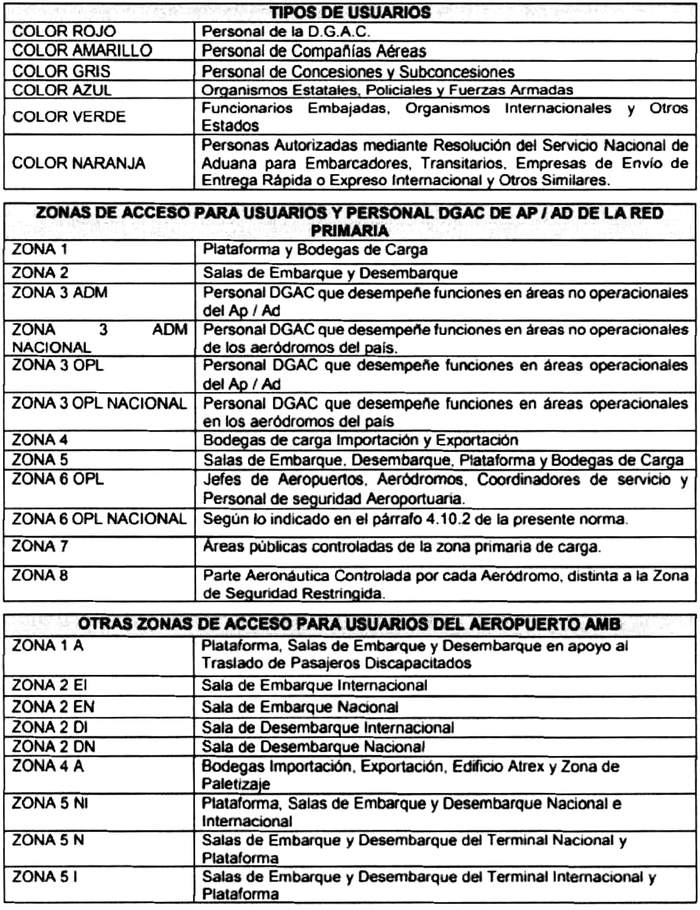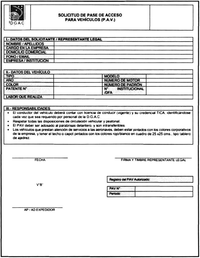 3.1 ALCANCE DE LA NORMA 3.1.1 Las disposiciones contenidas en la presente Norma Aeronáutica son aplicables a: a) Organismos públicos que desarrollan funciones en los aeródromos (incluidas FF.AA. y Fuerzas de Orden y Seguridad). b) Explotadores de aeronaves nacionales e internacionales. c) Explotadores de terminales de pasajeros. d) Bases Fijas de Mantenimiento FBO (Operador de Base Fija o Fixed Base Operator). e) Empresas de servicios que operan en aeródromos. f) Agencias de carga acreditadas por la autoridad aeronáutica. g) Embajadas y organismos internacionales acreditados por el Ministerio de Relaciones Exteriores. h) Servicios de seguridad privada y de transporte de valores. i) Clubes aéreos. j) Hangares particulares o corporativos. k) Empresas de aviación general. l) Entidades autorizadas mediante resolución del Servicio Nacional de Aduanas, considerando entre ellas: Agente de Aduana, Auxiliar de Aduana, Embarcador, Transitarios, Empresas de Envío de Entrega Rápida o Expreso Internacional. 3.1.2 Las credenciales aeroportuarias que regula la presente norma aeronáutica son: a) Tarjeta de Ingreso de Controlado de Aeródromos (TICA); b) Pase de Acceso de Vehículos (PAV). 3.2 DISPOSICIONES GENERALES 3.2.1 Las entidades indicadas en el párrafo 3.1.1, serán responsables ante la DGAC de la solicitud, tramitación y devolución de las credenciales aeroportuarias de sus empleados, funcionarios y vehículos. 3.2.2 Las entidades indicadas en el párrafo 3.1.1 deberán controlar el uso y porte de la credencial y pase aeroportuario, en actividades propias del servicio por parte de sus empleados y vehículos. 3.2.3 Todos los gastos que se originen en el otorgamiento de la credencial y pase aeroportuario, o por cambios de estos solicitados por las empresas, serán de cargo de la persona o entidad interesada, en conformidad a lo previsto en el Reglamento DAR-50, Tasas y Derechos Aeronáuticos. 3.2.4 Los explotadores de terminales de pasajeros informarán por escrito a la Autoridad Aeroportuaria aquellas empresas que deban desarrollar funciones operacionales o de servicio en el edificio terminal o en la parte aeronáutica del aeródromo, así como de la descripción del servicio que prestarán. 3.2.5 Sin perjuicio de lo anterior, el explotador del terminal de pasajeros informará a la DGAC con una anticipación de a lo menos 72 horas, el nombre de las concesiones que dejan de prestar servicios en el aeródromo. 3.2.6 Las empresas que cuenten con personal de nacionalidad extranjera deberán comprobar ante la DGAC su residencia legal en el país y que sus condiciones y calidades de permanencia les permiten realizar la actividad requerida. 3.2.7 La DGAC asentará en el instrumento respectivo esta comprobación, mediante la presentación del pasaporte o documento de identidad y de uno de los siguientes documentos vigentes: a) Visa de residencia sujeta a contrato. b) Visa temporaria. c) Permiso especial de tripulantes. d) Tarjeta especial de trabajo para extranjero con residencia en trámite. e) Tarjeta especial de trabajo para turista extranjero. f) Otro tipo de autorizaciones otorgadas por el Departamento de Extranjería y Migraciones o de Policía Internacional. 3.2.8 Si no pudieren cumplir con las exigencias señaladas precedentemente, la DGAC comunicará este hecho a la autoridad policial más cercana, denegando el otorgamiento de la TICA. 3.2.9 El titular de una credencial deberá circular exclusivamente en las zonas de acceso autorizado. 3.2.10 El titular de una credencial deberá adoptar personalmente las medidas de seguridad con su credencial para evitar su extravío o deterioro.