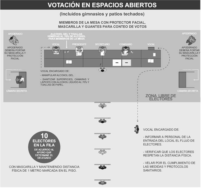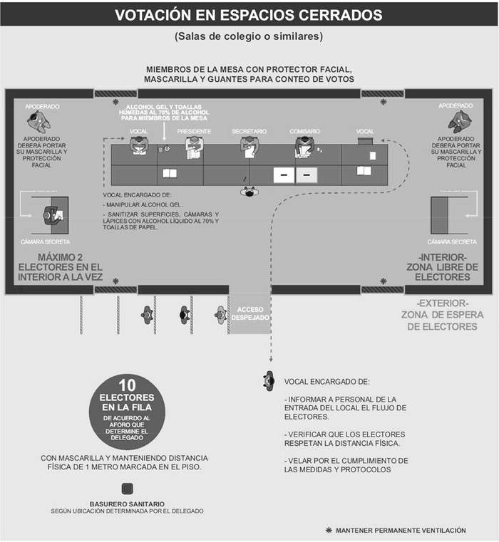 - Se recomienda que los locales de votación tengan habilitadas puertas de ingreso y salida distintas, para permitir el flujo unidireccional y evitar aglomeraciones.