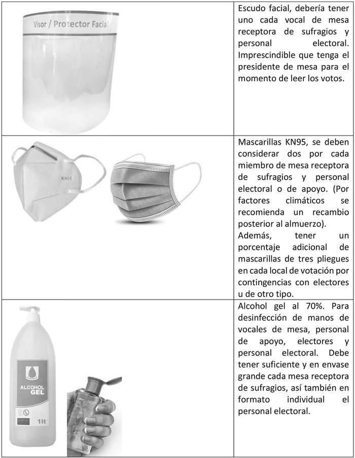 - Todo el personal involucrado en las fases de escrutinio, escaneo y transmisión, deberá mantener la distancia física requerida de al menos un metro, utilizar permanentemente los medios de protección e higiene suministrados: mascarillas KN95 o quirúrgicas desechables de tres pliegues, escudos faciales, y alcohol gel al 70%. El público, apoderados y medios de comunicación deberán utilizar en todo momento sus propias mascarillas y mantener la distancia física requerida de al menos un metro. El Presidente de la mesa está investido de la autoridad para hacer cumplir estas medidas. Especialmente, para hacer el conteo de los votos públicamente y en voz alta, el Presidente de la mesa deberá utilizar escudo facial, debiendo el resto de los presentes mantener silencio para facilitar la lectura de los votos (que puede verse dificultado por el uso de mascarilla).
