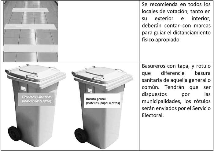 - Se deberán reforzar los basureros con tapa al interior de los locales de votación y colocando bolsas de basura grande (basureros de hasta 240 Lts), para asegurar la protección del personal de aseo. Además, duplicando su capacidad y señalando claramente cuáles son los indicados para botar la basura sanitaria (la señalización de éstos deberá ser de color rojo). Se entenderá por basura sanitaria las mascarillas, escudos faciales, guantes, toallas de higienización u otro que se haya utilizado para cuidado personal o limpiar materiales. Los municipios deberán hacer retiro periódico de la basura y limpieza de los locales de votación.