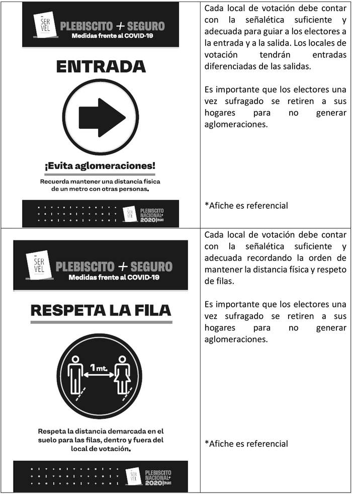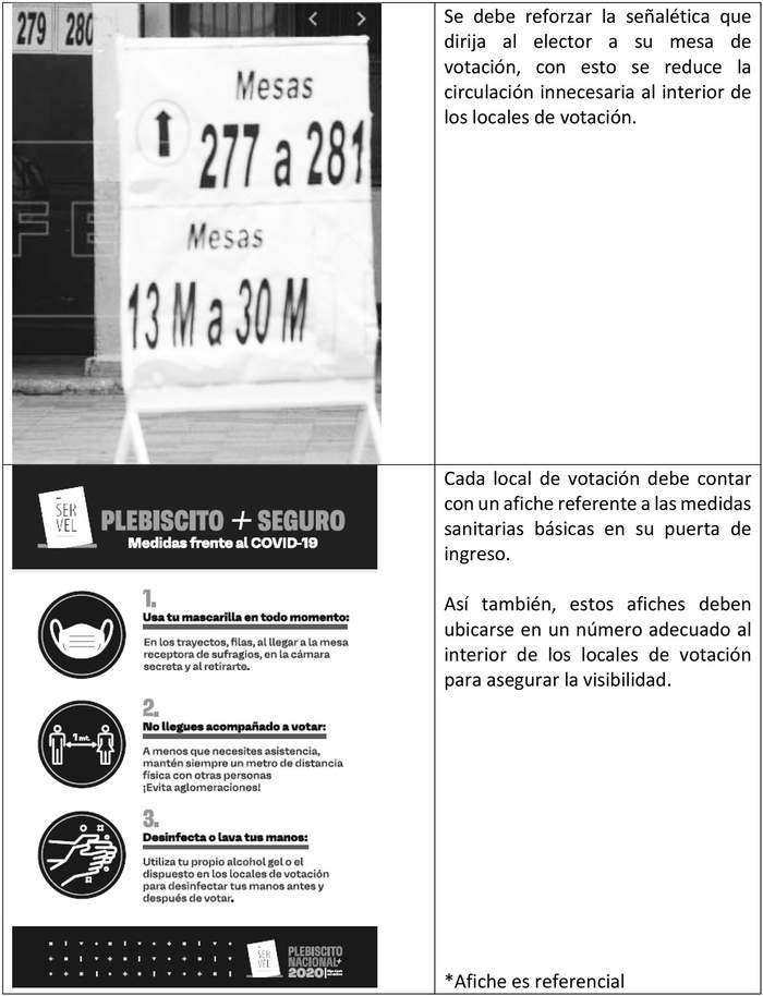 - Tanto en el exterior como en el interior de los locales de votación, se deben colocar afiches que orienten al elector sobre medidas sanitarias, entradas y salidas.