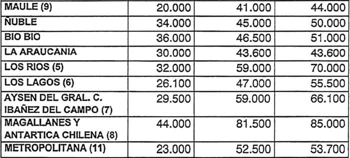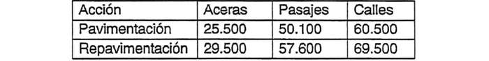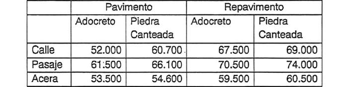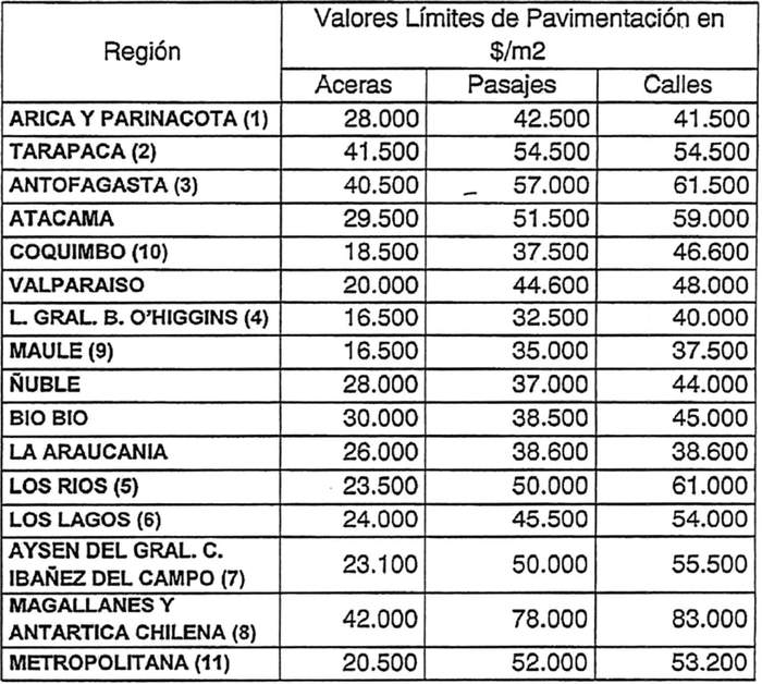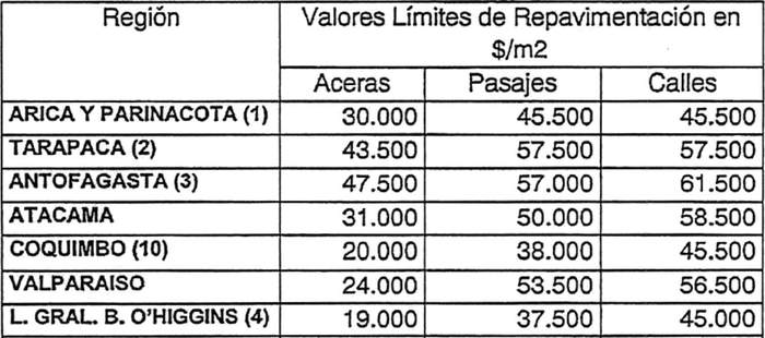 (6) En las comunas de la Provincia de Palena, los valores límites de pavimentación son $90.000/m2 en calles, $75.000/m2 en pasajes y $44.000/m2 en aceras, y de repavimentación son $91.000/m2 en calles, $79.000/m2 en pasajes y $45.000/m2 en aceras.