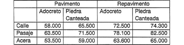 Para las aceras en adocreto de la comuna de Arica, su valor límite en pavimentos es de $41.000/m2 y en repavimentos es de $45.500/m2.