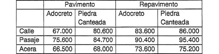 (2) Para la comuna de Colchane, los valores límites de pavimentos y repavimentos en adocretos es $95.100/m2 y $91.100/m2, respectivamente, tanto para calles como pasajes. Los valores límites de pavimentos y repavimentos en adoquín de piedra canteada es $99.100/m2 y $103.100/m2, respectivamente, tanto para calles como pasajes.