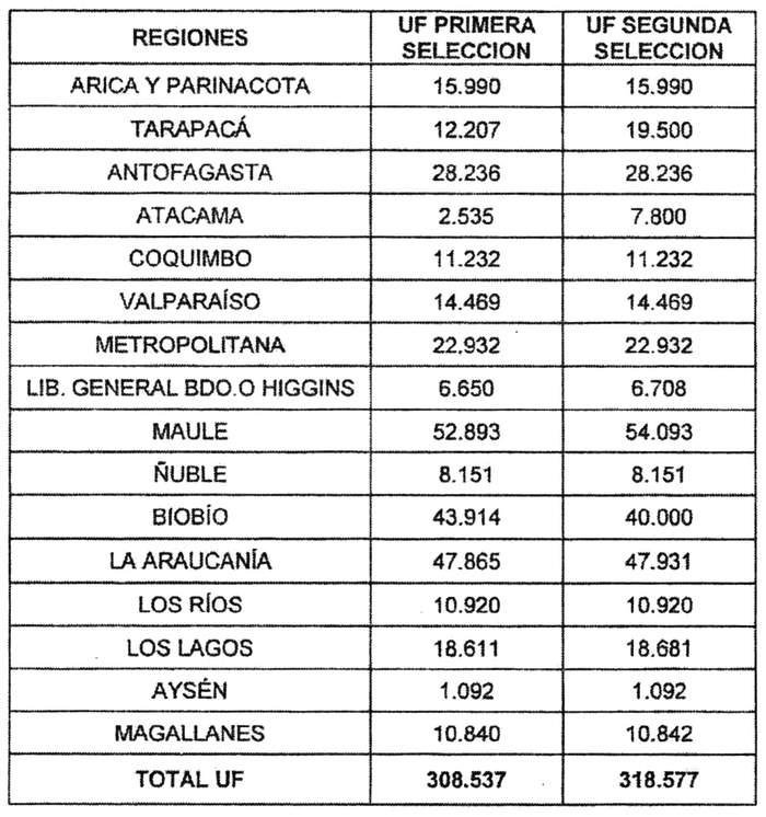 "El monto destinado para este llamado será de 318.577 UF y el número de proyectos seleccionados alcanzará hasta la cantidad de subsidios susceptibles de ser financiados con los recursos disponibles, incluidos los servicios de Asistencia Técnica que corresponden. La distribución regional de estos recursos es la siguiente: