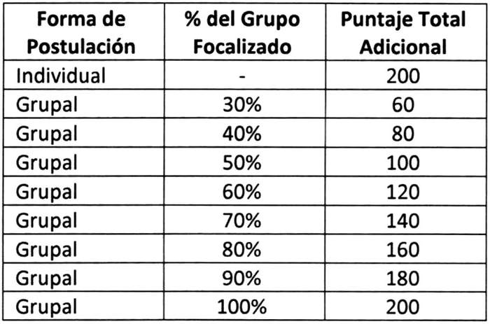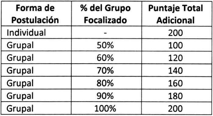 2.4. A los proyectos focalizados señalados en el presente resuelvo, a excepción de aquellos indicados en el punto 2.2, al total del grupo se le otorgará un puntaje adicional a los ya dispuestos en el D.S. Nº 255 (V. y U.), de 2006 y sus modificaciones, de acuerdo a lo indicado en los siguientes cuadros: