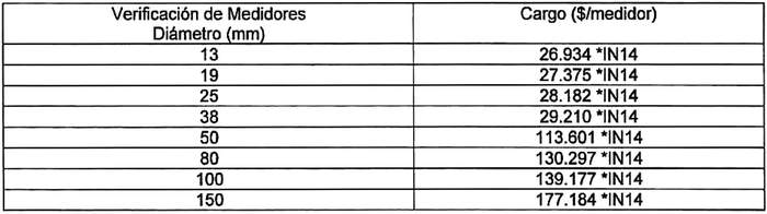 El prestador podrá cobrar por concepto de verificación de medidores el Cargo x IN14 de acuerdo a los siguientes valores: