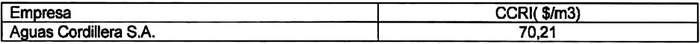 Se aplicará a Aguas Cordillera S.A. el cargo "Recolección Aguas Cordillera", de $10,66*IN8 pesos, por la suma de los metros cúbicos de agua potable facturados a sus clientes que cuenten con servicio de alcantarillado. No se debe aplicar este cargo a los clientes que pertenecen a otras empresas que se interconectan en el alcantarillado a Aguas Cordillera S.A.