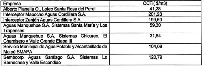Se cobrará el valor CAPTi*TTi en la forma que se indica en el punto 2.5.1 del presente decreto, por cada metro cúbico de servicio de agua potable facturado a los usuarios de alcantarillado de las siguientes empresas interconectadas con Aguas Andinas S.A.: