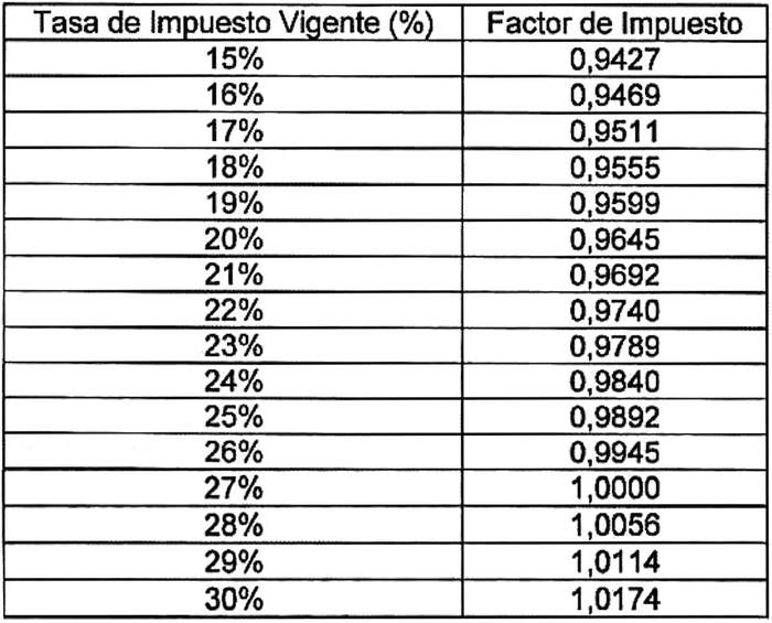 Los valores resultantes de la aplicación de los cargos anteriormente mencionados en este decreto, se incrementarán en función de la tasa de tributación vigente que grava las utilidades de las sociedades anónimas abiertas, considerando los factores para las tasas de tributación que se indican a continuación (tasas intermedias se interpolarán linealmente).