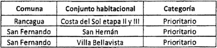 1. Establézcanse las siguientes copropiedades en la Región del Libertador General Bernardo O'Higgins como "conjuntos de interés regional" en el marco del proceso de prelación por parte de la comisión evaluadora del llamado regional en condiciones especiales 2020, considerando la categorización correspondiente: