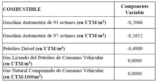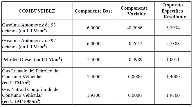 1.- Determínanse los siguientes componentes variables de los impuestos específicos establecidos en la Ley N° 18.502, que establece impuestos a los combustibles que señala, en virtud de lo señalado en el artículo 3 de la Ley N° 20.765: