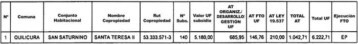 Califícanse de extrema relevancia y, en consecuencia, asígnense directamente 140 subsidios, regulados por el Programa de Mejoramiento de Viviendas y Barrios, regido por el DS N° 27 (V. y U.), de 2016, Capítulo Tercero, para Proyectos de Condominios de Viviendas, tipología de Proyecto de Mejoramiento de Bienes Comunes (Artículo 81, numeral 1, letras a) y c)), los cuales tienen como objetivo atender problemas de evacuación de aguas lluvia en el terreno de la Copropiedad, mejorar áreas de la cubierta que presenten filtraciones de aguas lluvia e incorporar una gatera exterior para el acceso a la misma, patrocinados por la PSAT Proyecta 3 Ltda., a la copropiedad "Santa Teresa II", del Conjunto Habitacional San Saturnino, conforme a montos que a continuación se detalla: