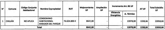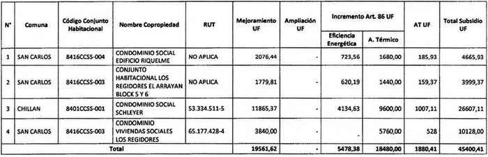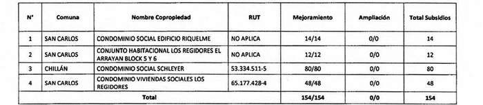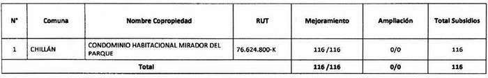 Conforme lo dispuesto en el artículo 29 inciso segundo, del DS N° 27 (V. y U.), de 2016 y sus modificaciones, se publica en extracto la resolución exenta N° 448, de fecha 11.12.2020, modificada por resolución exenta N° 449 de fecha 16.12.2020, ambas de la Seremi de Vivienda y Urbanismo Región de Ñuble, que selecciona a las comunidades y sus respectivos proyectos del llamado en condiciones especiales dispuesto por resolución exenta N° 814 (V. y U.), de 2020 y sus modificaciones, para proyectos de Mejoramiento de Viviendas y Barrios, Capítulo Tercero, para Condominios de Viviendas.