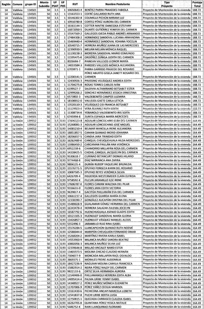 D.O. 14.01.2021. Publíquese en un periódico de circulación regional, por el Servicio de Vivienda y Urbanización Los Ríos, un aviso que indique el lugar y fecha en que serán anunciadas las nóminas de los postulantes seleccionados y los respectivos proyectos, conforme al resuelvo 1º de esta resolución, las que deberán contener a lo menos el Título del Programa del cual se trate, el nombre del grupo, el nombre de cada postulante con su respectiva Cédula de Identidad, el nombre del proyecto y el puntaje obtenido por el grupo o persona.