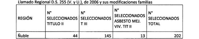 1º Apruébase la nómina de postulantes seleccionados para el otorgamiento de subsidios habitacionales, correspondientes al Llamado Regional en condiciones especiales dispuesto por resolución exenta Nº 422, de fecha 19.11.2020, de la Secretaría Regional Ministerial de Vivienda y Urbanismo Región de Ñuble, para proyectos de los Títulos II y III, del Programa de Protección del Patrimonio Familiar, nómina que se adjunta y se entenderá formar parte integrante de esta resolución. Además, fíjase el número de postulantes seleccionados, según se indica en la siguiente tabla: