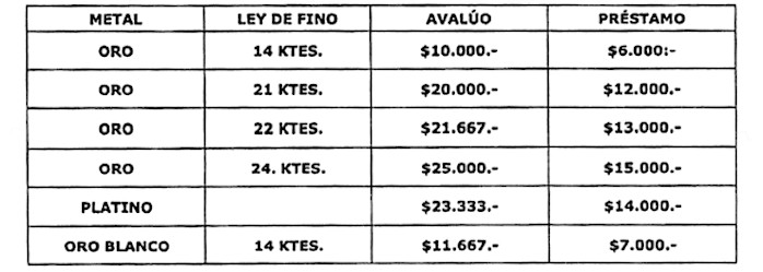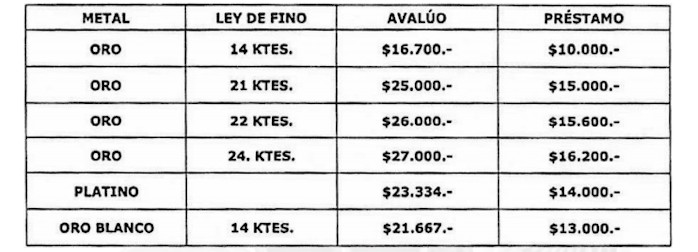 2. Fíjese Nuevo Avalúo por el gramo de metales nobles, utilizando por las Unidades de Crédito en el cálculo de los préstamos con garantía prendaria del rubro alhajas conforme a la siguiente tabla y las siguientes condiciones: