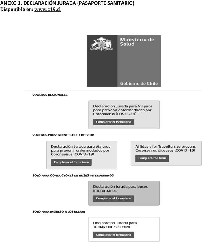 Declaración Jurada para viajeros para prevenir enfermedades por coronavirus: Es una declaración jurada obligatoria de carácter electrónico, para todos los viajeros que ingresan al país o una región, y que caracteriza su estado de salud al momento de iniciar su viaje. La Declaración Jurada para viajeros debe completarse 24 horas antes de iniciar el viaje por todas aquellas personas provenientes del extranjero y por aquellas que necesitan trasladarse desde una región a otra (dentro de Chile), ambas a través de la plataforma en línea www.c19.cl.