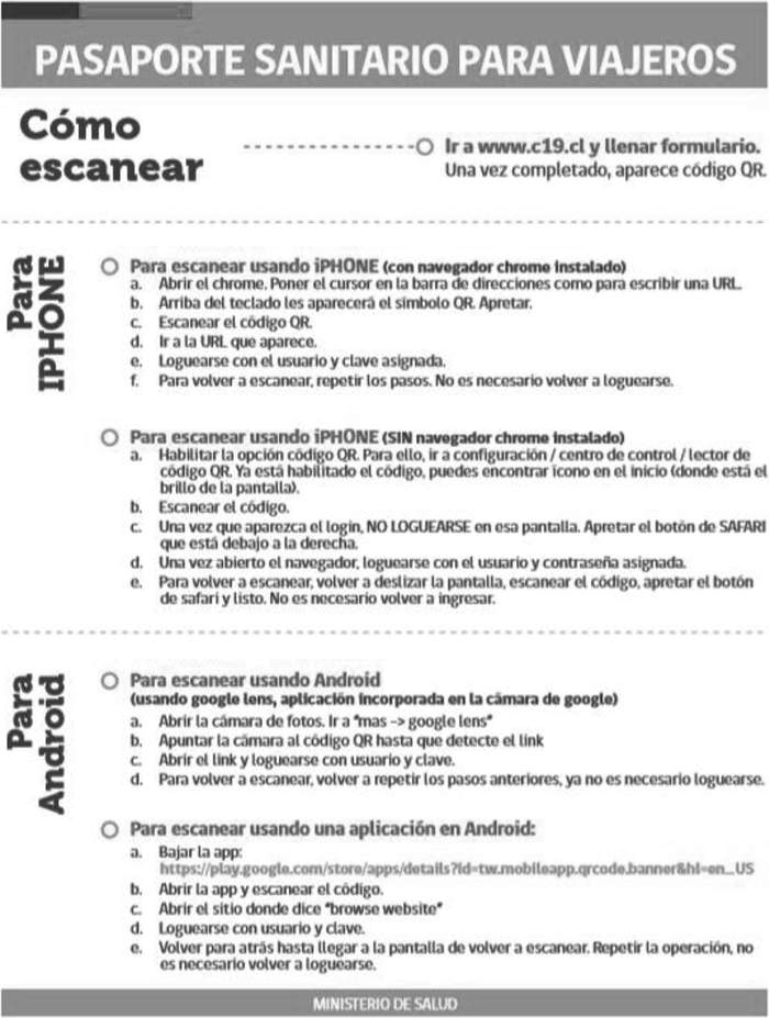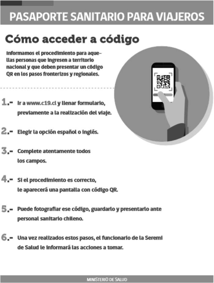 1. Todo viajero proveniente del extranjero deberá llenar la Declaración Jurada on line para poder ingresar a Chile. En caso que el viajero no la haya gestionado (por falta de internet o cualquier otra causa), deberá completarla en papel en el respectivo Punto de Entrada o Aduana Sanitaria (Anexo 1). Esta declaración Jurada arrojará a cada viajero un Pasaporte Sanitario, con la clasificación de riesgo respectiva, a través de un código QR.