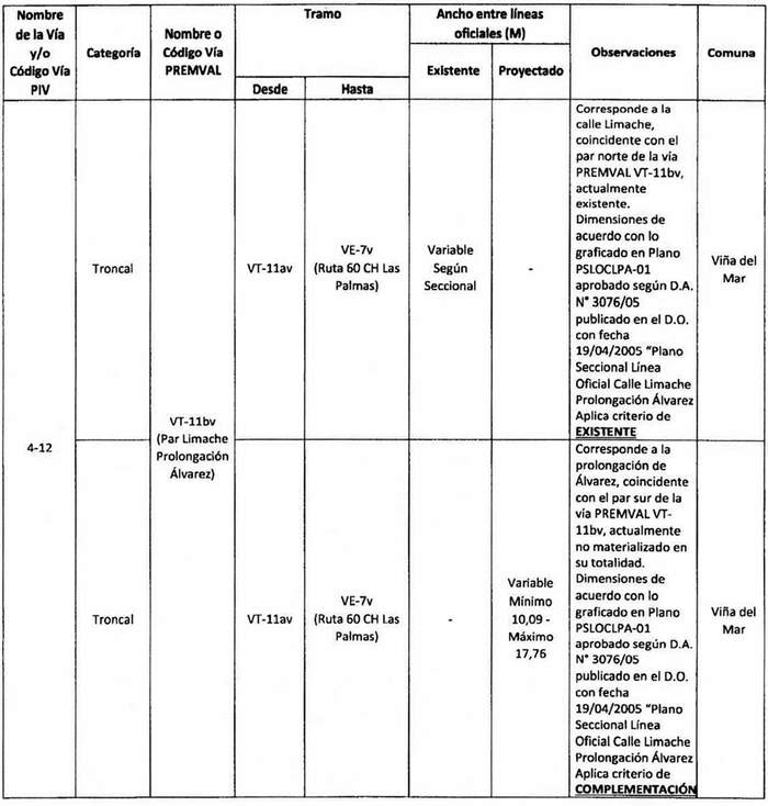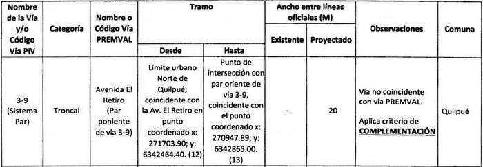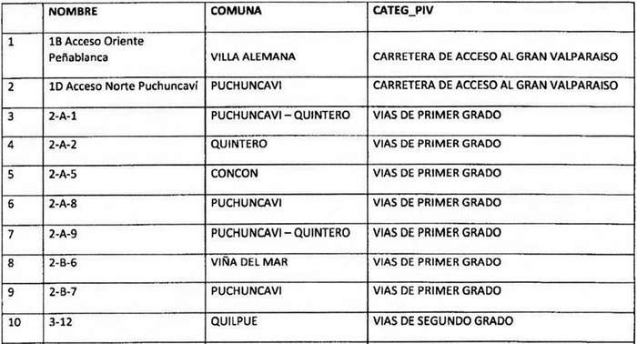 12. A continuación, se transcribe la tabla que contiene la nómina de las vialidades vigentes del PIV que se deben entender incorporadas a la red vial estructurante metropolitana establecida por el PREMVAL. En este sentido esta nómina circunscribe el universo de aplicación del presente acto administrativo: