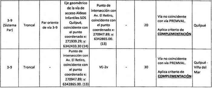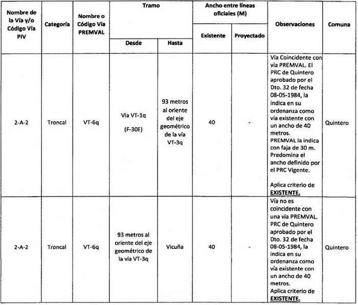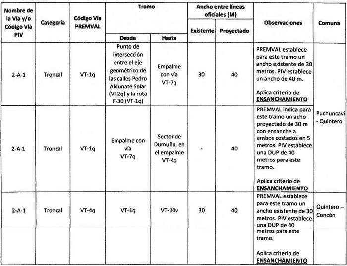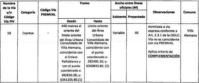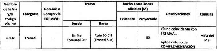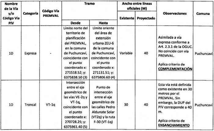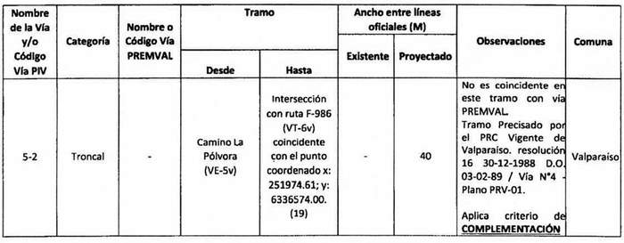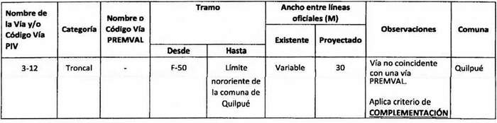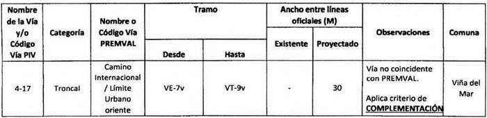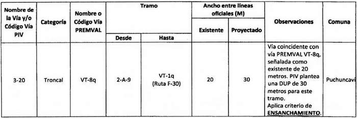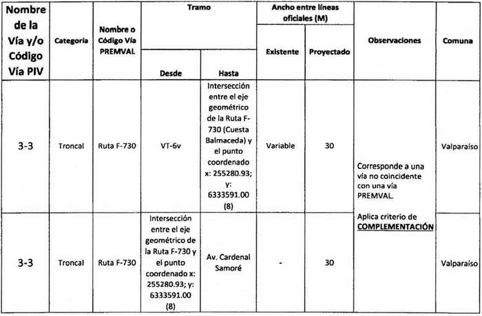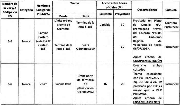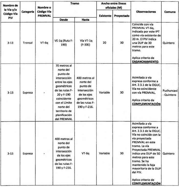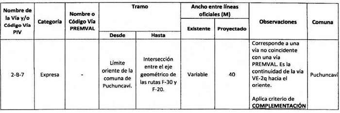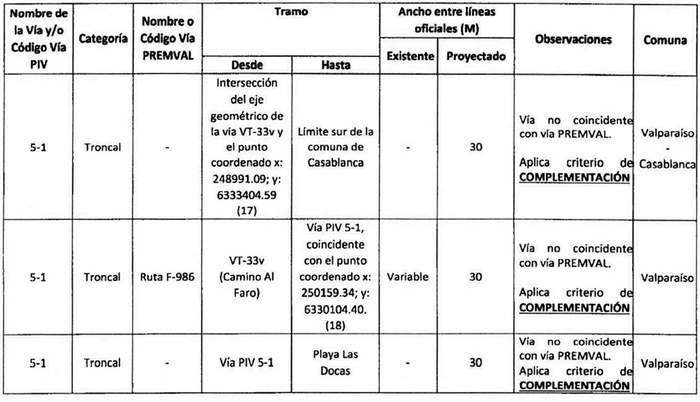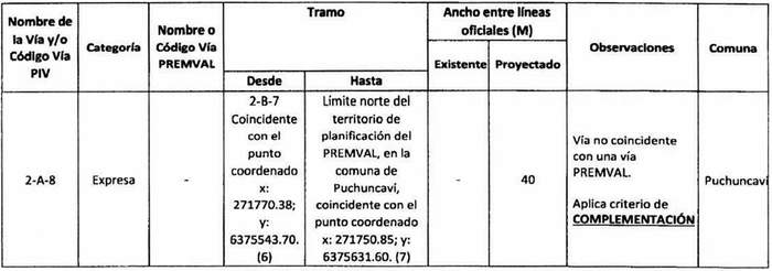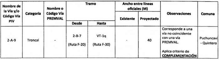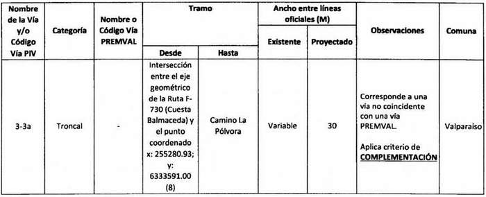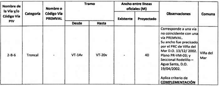 e. Complementación: Cuando alguna declaratoria del PIV reestablecida por la ley N° 20.791 suponga una vía distinta a las contempladas en el Premval, deberá integrarse al cuadro de vías de este último incorporando todos los antecedentes de dimensiones, tramos, observaciones, etc. del cuadro de vías.
