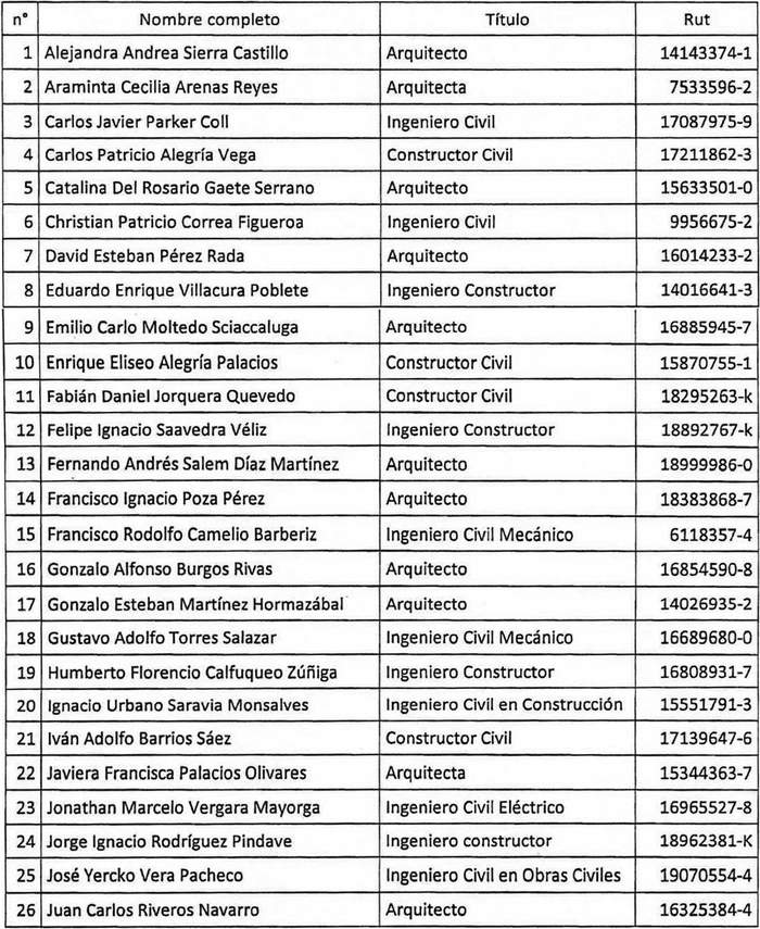 2. Desígnase a los siguientes profesionales externos al Ministerio de Vivienda y Urbanismo, que aprobaron el proceso de acreditación, para actuar como "Evaluadores Energéticos Externos", para que puedan realizar la calificación energética de proyectos que el Ministerio de Vivienda y Urbanismo o Serviu les encargue, como asimismo de proyectos particulares: