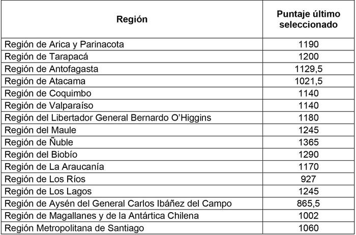 d) Que, conforme lo señalado en el considerando anterior, todos los postulantes cuyo puntaje de selección resulte inferior al puntaje que obtuvo el último seleccionado en su región, no resultará seleccionado por este acto;