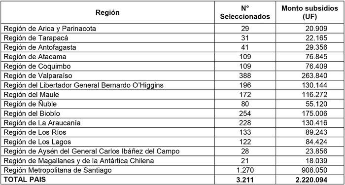 3. Los recursos comprometidos conforme al Resuelvo 2. de la presente resolución, para los postulantes seleccionados en el concurso a que se llamó por resolución exenta N° 1.140 (V. y U.), de 2020, se detallan en el siguiente cuadro para cada región convocada, considerando los montos de subsidio referenciales, según el monto de subsidio a considerar establecido en su Resuelvo 14: