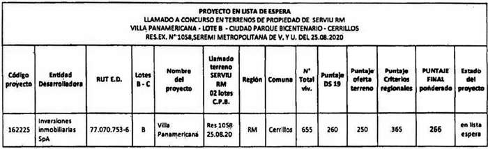 . 4° Dispóngase en lista de espera, el proyecto denominado "Villa Panamericana", Código de Proyecto N°162225, de la Entidad Desarrolladora "Inversiones Inmobiliaria SpA", a desarrollarse en el Lote B, por obtener el más bajo puntaje final ponderado y por cumplir con los requisitos obligatorios señalados en el llamado. La vigencia de dicha lista de espera será de 180 días a partir de la total tramitación de la presente resolución exenta. Posteriormente, el proyecto será eliminado del Concurso.