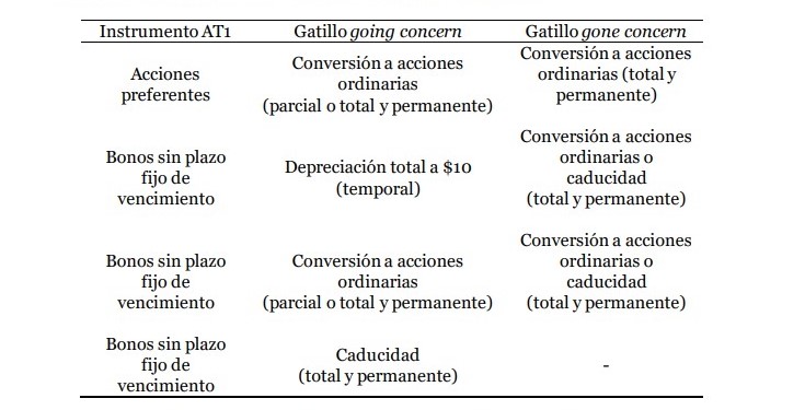 Los instrumentos deberán considerar al menos dos tipos de gatillos. El primero se activará cuando el banco esté operando con normalidad, pero su nivel de capital muestre señales de deterioro (going concern) al caer por debajo de 5,125% de CET1 sobre los APR o un nivel mayor establecido por el banco en las condiciones de emisión. El segundo gatillo está vinculado a las situaciones de insolvencia del artículo 130 de la LGB (gone concern).