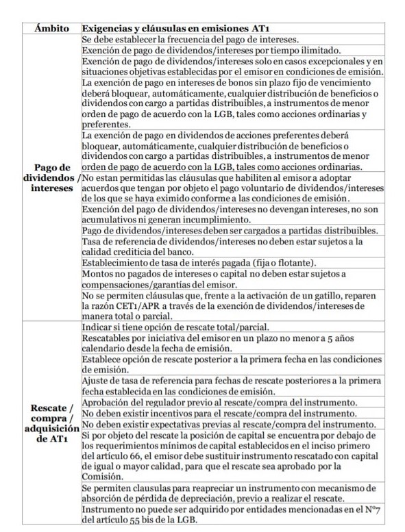 Estas exigencias pretenden cubrir los aspectos prudenciales establecidos en este Capítulo, junto con mitigar la complejidad de emisión de este tipo de instrumentos y facilitar la comparabilidad de los términos y condiciones de los AT1 frente a la evaluación del cumplimiento de las disposiciones regulatorias.