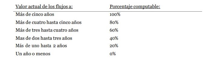Por consiguiente, el cálculo del importe computable como patrimonio efectivo deberá efectuarse sobre el valor actual de los bonos según la tasa efectiva de colocación, aplicando los siguientes porcentajes según los años remanentes (no calendarios):