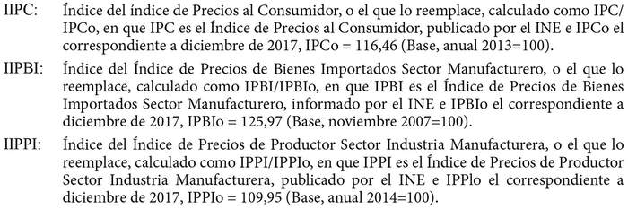 La definición de las variables incorporadas en las fórmulas tarifarias anteriores y sus respectivos valores, al 31 de diciembre de 2017, son los indicados a continuación: