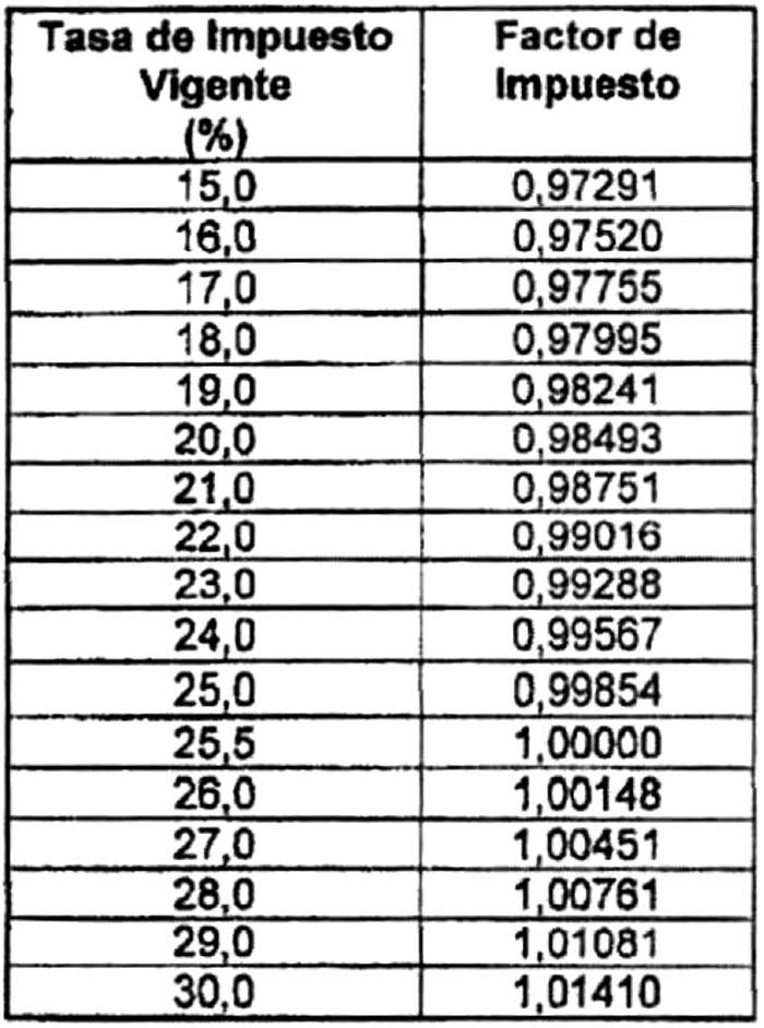 Los valores resultantes de la aplicación de los cargos anteriormente mencionados en este decreto, se incrementarán en función de la tasa de tributación vigente que grava las utilidades de las sociedades anónimas abiertas, considerando los factores para las tasas de tributación que se indican a continuación (tasas intermedias se interpolarán linealmente):
