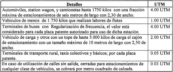1.1.- Se concederá permiso de estacionamiento reservado en BNUP en los casos en que la Ley de Tránsito y demás normas legales y reglamentarias aplicables lo permitan. El estacionamiento reservado en bien nacional de uso público estará gravado con los siguientes derechos, por cada cajón de estacionamiento, cuyo valor será cobrado anualmente, por UTM o fracción de ella, según las siguientes clasificaciones: