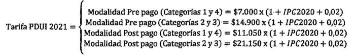 . Si el Pase Diario Único Interoperable como modalidad de postpago se adquiere dentro de los 2 (dos) días siguientes al día de circulación por la vía concesionada, tendrá el mismo valor que un PDUI en modalidad de prepago. Por lo anterior, su valor será de $7.000 (siete mil pesos) para vehículos livianos (Categorías 1 y 4) y $14.900 (catorce mil novecientos pesos) para vehículos pesados (Categorías 2 y 3). Sin perjuicio del valor señalado en el presente numeral xi, este Pase Diario operará en los términos y condiciones estipulados en el presente decreto supremo para la modalidad de postpago.