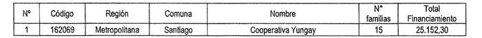 2. Apruébase la selección de la Cooperativa Cerrada de Vivienda indicada en la siguiente tabla, con su respectivo financiamiento total, el cual incluye los servicios de asistencia técnica, fiscalización técnica de obras y aranceles del Conservador de Bienes Raíces, detallados en el resuelvo 4, para el otorgamiento de subsidios del Programa Habitacional Fondo Solidario de Elección de Vivienda en la alternativa de postulación colectiva, para adquisición de terrenos y desarrollo de proyectos de Construcción en Nuevos Terrenos, en la Región Metropolitana, correspondiente al proceso de selección cuyo cierre de postulación se efectuó el día 26 de noviembre de 2020, del llamado efectuado por resolución exenta Nº 1.266 (V. y U.), de 2020, y su modificación:
