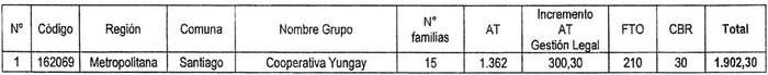 4. Asígnase a la Cooperativa Cerrada de Vivienda seleccionada en el resuelvo 2. de la presente resolución, por concepto de pago por los Servicios de Asistencia Técnica, por las Labores de Fiscalización Técnica de Obra y pago de Aranceles al Conservador de Bienes Raíces para el desarrollo de sus proyectos, los montos expresados en Unidades de Fomento que se detallan a continuación:
