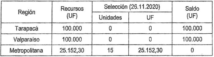5. Los recursos comprometidos en el resuelvo 2 de la presente resolución, para el proyecto seleccionado en el concurso a que se llamó por resolución exenta Nº 1.266 (V. y U.), de 2020, y su modificación, cuyo cierre de postulación se efectuó el día 26 de noviembre de 2020, se resumen en el siguiente cuadro para cada región del país, según corresponda, incluyendo la suma total de familias beneficiadas y Unidades de Fomento comprometidas, considerando los montos de subsidio de los proyectos, incluidos sus respectivos Servicios de Asistencia Técnica, Fiscalización Técnica de Obras y aranceles del Conservador de Bienes Raíces: