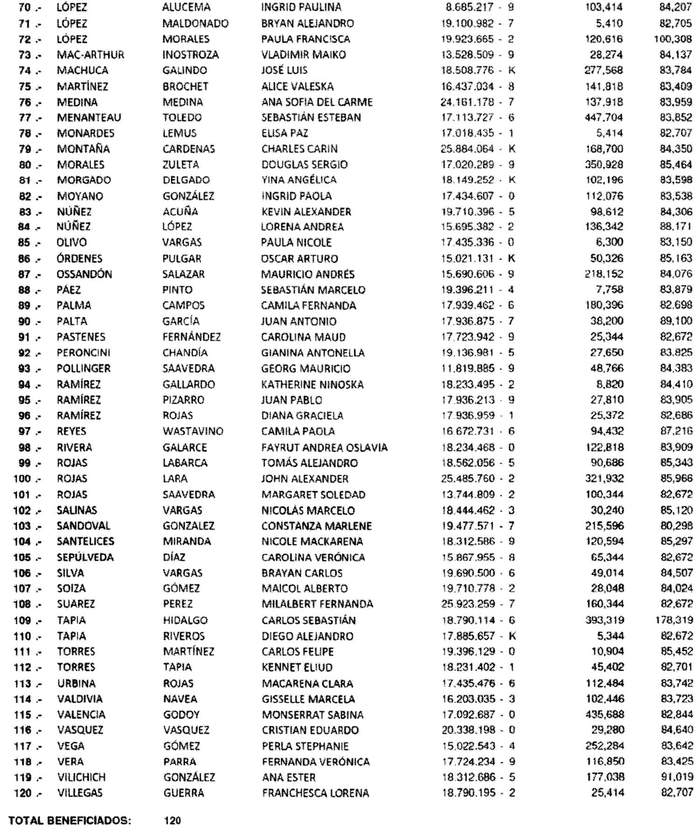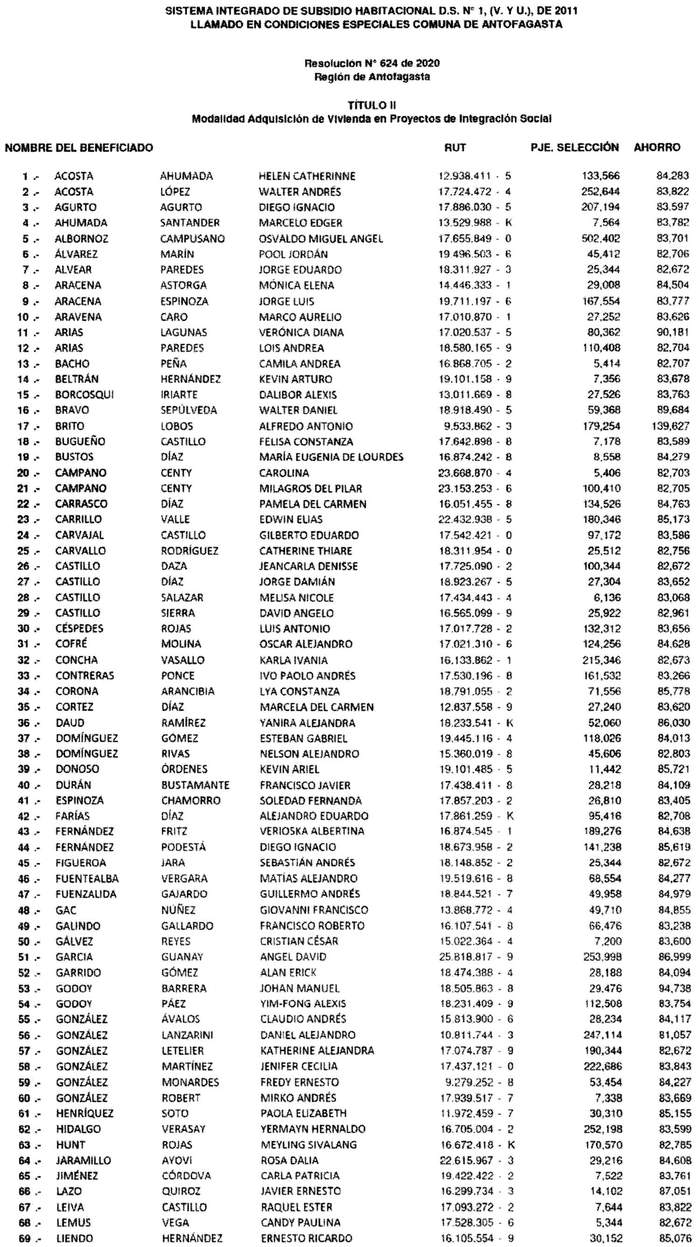 I.- Apruébese el listado de postulantes beneficiados en el proceso de selección del mes de diciembre de 2020, del Llamado Especial DS N° 1 de la Región de Antofagasta, en el siguiente tenor: