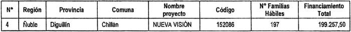 c. Reemplázase en la tabla inserta en su Anexo Único, en la fila Nº 4, correspondiente a la Región de Ñuble, proyecto "Nueva Visión", código 152086, los siguientes montos según la columna que se identifica a continuación: